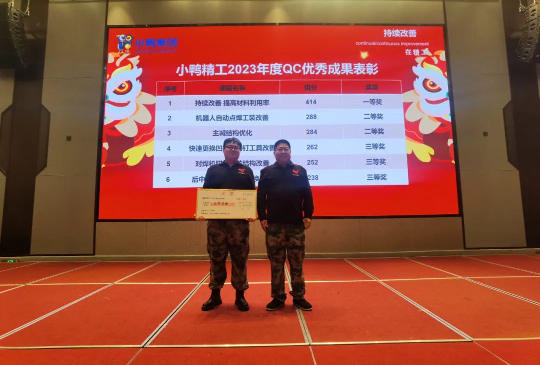 降本增效,提高質量,持續改進。12月30日,小鴨精工2023年度QC優秀成果發表會在萊蕪舉辦。經過一年的精選和籌備,共有6個項目在本次會議上發布,成果涵蓋汽車零部件產品、車橋產品、車輪裝備產品、模具產品、機器人應用等。