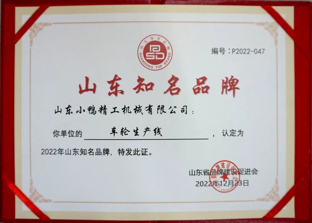 近日,根據《山東知名品牌認定管理辦法》的規定,經組織申報資格審查、大數據信息挖掘、信息化系統平臺評審、專家評審認定專家委員會審議、認定委員會認定等工作程序,山東小鴨精工機械有限公司的車輪生產線項目被認定為2022年山東知名品牌。