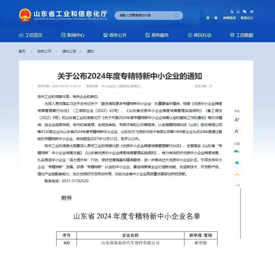 喜報,小鴨精工車橋基地(國基泰祥廠區)獲山東省2024年度專精特新中小企業稱號