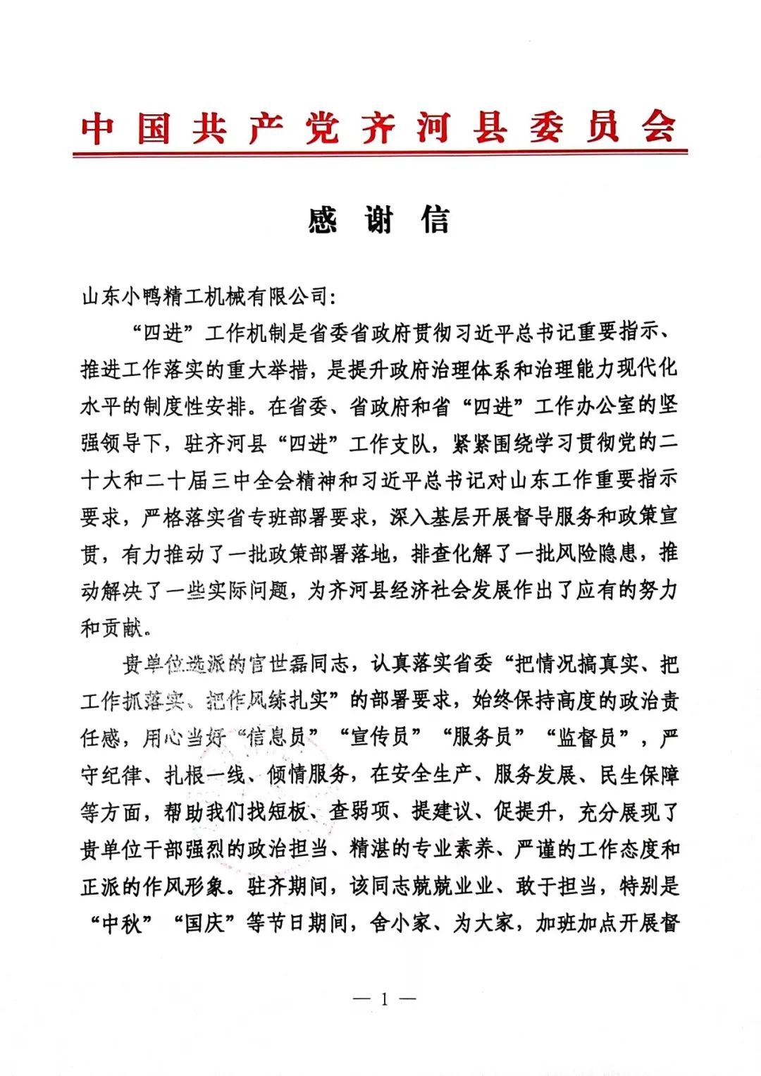 自5月4號開始,小鴨精工選派干部骨干宮世磊同志到駐齊河縣“四進”工作支隊報道,開展為期6個月的省“四進”工作。工作期間,宮世磊同志認真落實省委“把情況搞真實、把工作抓落實、把作風練扎實”的部署要求,始終保持高度的政治責任感,用心當好“信息員”“宣傳員”“服務員”“監督員”,嚴守紀律、扎根一線,傾情服務,在安全生產、服務發展、民生保障等方面,幫助齊河縣“四進”工作支隊找短板、查弱項、提建議、促提升,充分展現了小鴨精工人強烈的政治擔當、精湛的專業素養、嚴謹的工作態度和正派的作風形象。為此,齊河縣“四進”工作支隊特寫感謝信一封,感謝公司對“省四進”工作的大力支持,感謝官世磊同志的辛勤付出!