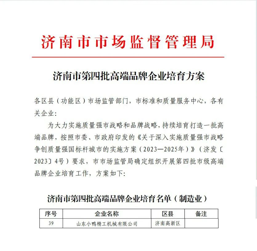 喜報,小鴨精工入選濟南市第四批高端品牌企業培育名單(制造業)
